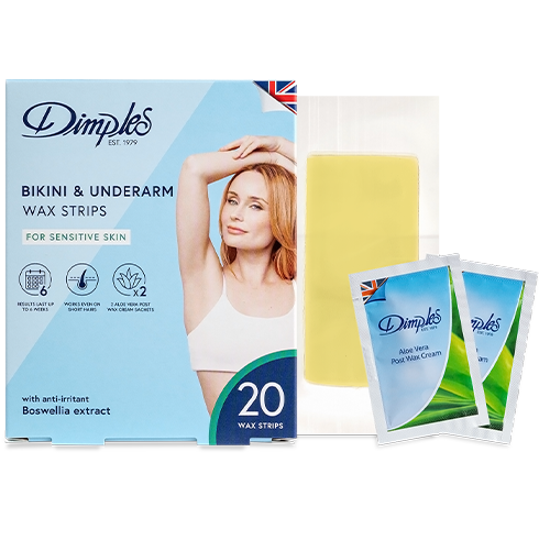 Bikini & Underarm Wax Strips – The modern cold wax method of removing unwanted hair. Formulated for sensitive skin, Dimples Bikini & Underarm Wax Strips contain Boswellia serrata extract, known as a soothing anti-irritant. Proven to reduce reddening, this natural ingredient is ideally suited to protect your sensitive skin.